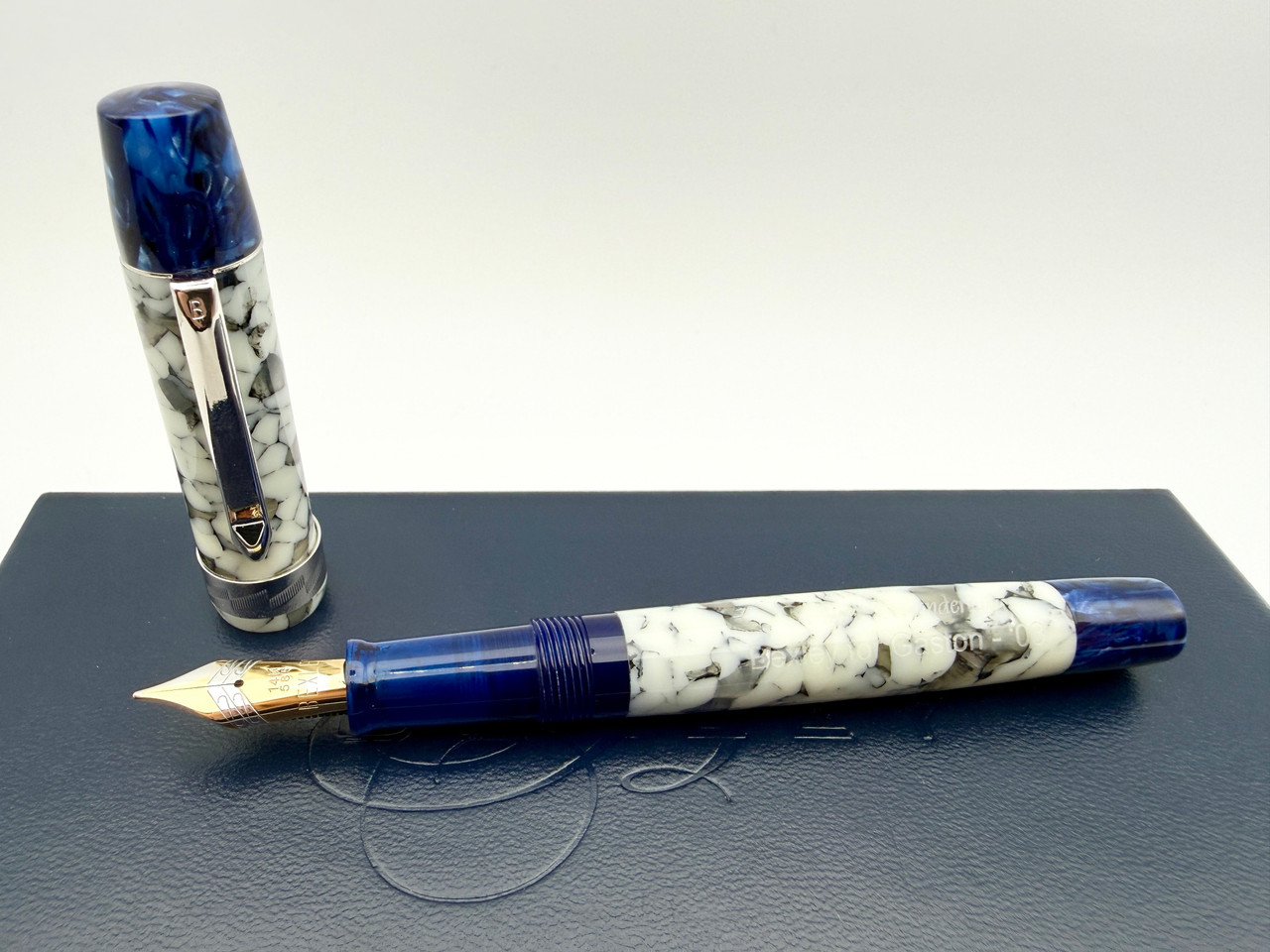 Loading... Please wait...Absolutely Beautiful Bexley Made in collaboration with late pen collector Jim Gaston. The Gastons Winter Wonderland series came in 3 different end colors, red, blue, and green, all with the same beautiful cracked ice body color. This specific pen is with the blue end pieces and a large #6 Fine point 14k solid gold Bexley nib that is very smooth on paper and a great writer. Comes in its original box with outer box and is piston fill!