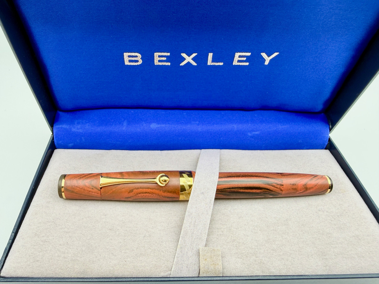 Loading... Please wait...Stunning Bexley Owners Club 2009 Limited Edition Fountain Pen in Red Black Woodgrain Ebonite (Hard Rubber). Pen is limited edition #074 out of 116 made worldwide in this color. Wonderful Fine point large 18k gold 2-tone nib that is extremely smooth on paper and a wonderful writer. Pen comes in its original box with converter.