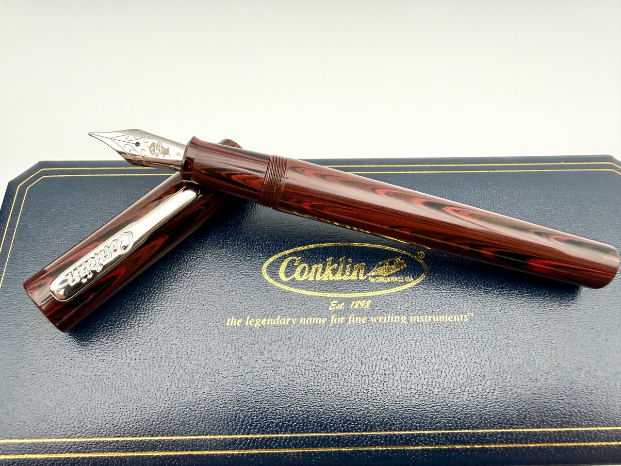 Loading... Please wait...The Conklin Classic Firelines Ebonite Fountain Pen in conjunction with Goulet Pens. Pen is numbered on end of barrel "092" and was a limited run through Goulet pens, a remake if you say of the "Classic" Conklin model fountain pen. Pen is cartridge or converter fill and comes in its original box with original converter. Medium point stainless nib that is very smooth on paper and a great writer.