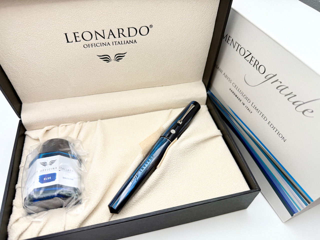 Absolutely Stunning Leonardo Momento Zero Grande Corsani Abyss Celluloid Limited Edition Fountain Pen of only 48 pieces made worldwide in this gorgeous celluloid made blue marbley color. Pen is gorgeous in hand and has a wonderful feel to it with its balanced weight, amazingly smooth fine point 14k rhodium plated nib, and great size. Pen comes new in its original box with limited edition ink bottle and all of its original paperwork and outer packaging. Fitted converter fill. Pen is #47 out of only 48.