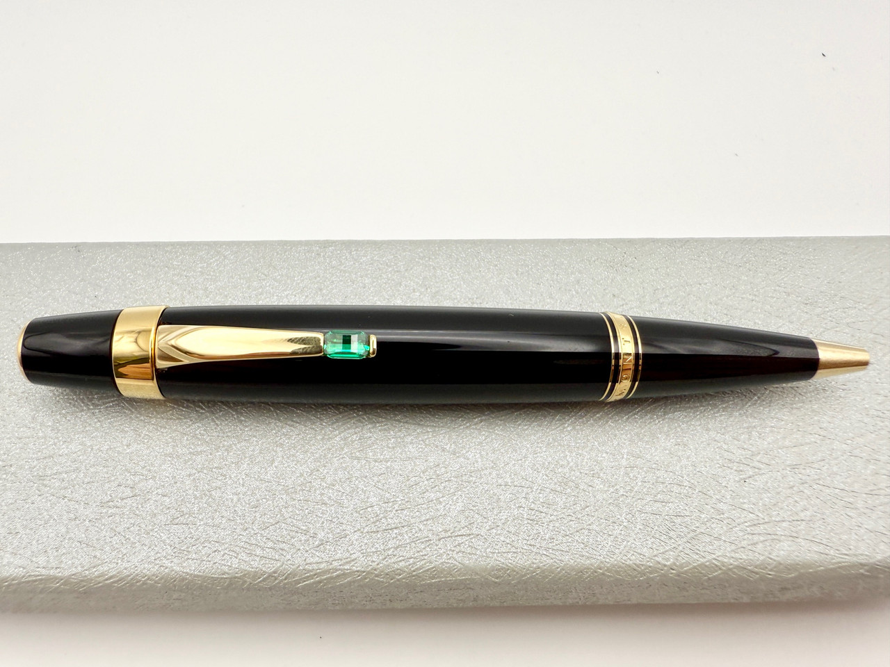 The Montblanc Bohème Green Emerald Stone Ballpoint Pen is a masterpiece of luxury and precision, featuring a sleek black precious resin body accented with Gold-plated trims for timeless elegance. A stunning Green Emerald gemstone, set into the clip, adds a touch of opulence and individuality. Pen is in excellent condition!