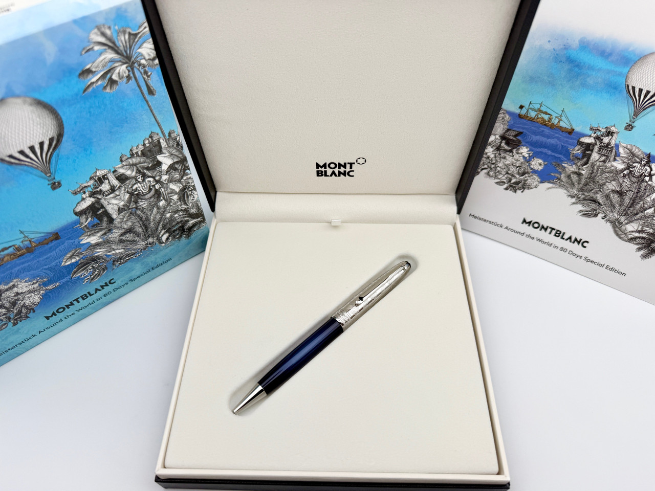 The Meisterstück Around the World in 80 Days collection draws its inspiration from Jules Verne's renowned adventure novel. The Solitaire Doué Classique Ballpoint, adorned in polished dark blue precious lacquer with a metal cap, recounts the epic journey of Mr. Fogg and Passepartout. Embarking on the final leg from Yokohama back to London via the United States, the duo traverses the vast American continent by train. Delve into the intricate details, a train elegantly lasered on the cap, a safety chain pattern on the cone, mirroring a pivotal moment when Passepartout detaches the train from the locomotive to save the crew who was attacked by Sioux. The cap's design captures pressure valves and the billowing smoke of the locomotive, while the clip boasts a red lacquered heart card suit, symbolizing the union between Phileas Fogg and Princess Aouda. Additionally, card suits represent Fogg's daring wager to complete the journey in a mere 80 days. The cap top bears the embossed timeline of the journey, 36 days from Yokohama to London, culminating in the grand total of 80 days around the world.