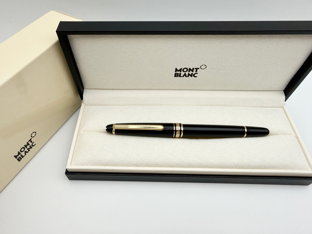 Montblanc Meisterstuck No. 144 Fountain Pen in black resin with gold trim. The Classique Montblanc fountain pen and predecessor to the new 145 Classique. Pen has a fine point 14k gold nib that is very smooth on paper and a wonderful writer. Cartridge or converter fill and will come with its original converter.