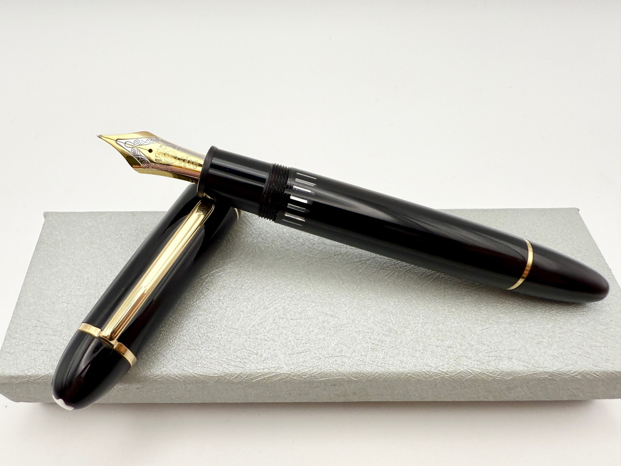 Loading... Please wait...Montblanc Meisterstuck No 149 Fountain Pen in classic Black with gold trim. Pen has a fine point large 18k tri-color solid gold nib that is extremely smooth on paper and an amazing writer. Brass filler thread unit and a very smooth piston filler that works perfectly. Pen is in excellent condition with no brassing and no heavy marks.