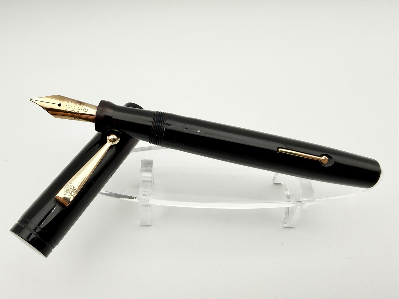 Loading... Please wait...Large Moore L-96 Fountain Pen in black with orange cap dot. Pen is in great condition with great color, deep barrel imprints, and a smooth broad point buttery flexy nib that does have a very small light hairline in base that does not affect ink flow or writing at all and should not get worse with use, it can be seen in the photos.
