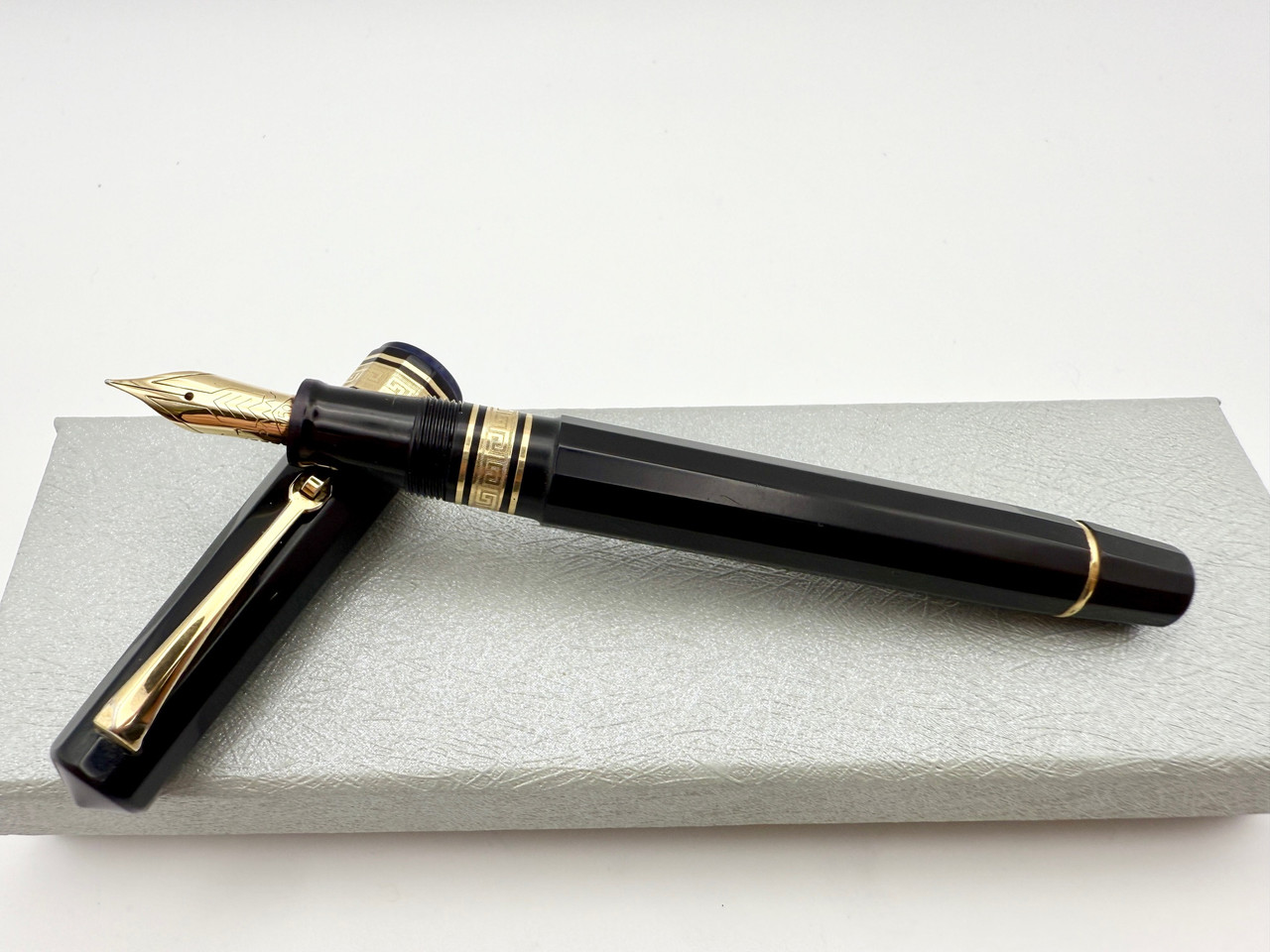 Loading... Please wait...Beautiful Old Style Omas Arte Ialitiana Faceted Fountain Pen in Black with gold trim. Pen is in great condition with a small scuff on barrel as seen in photos. Fine point 18k solid gold nib that is very smooth on paper and a great writer. Piston filing unit works perfectly.