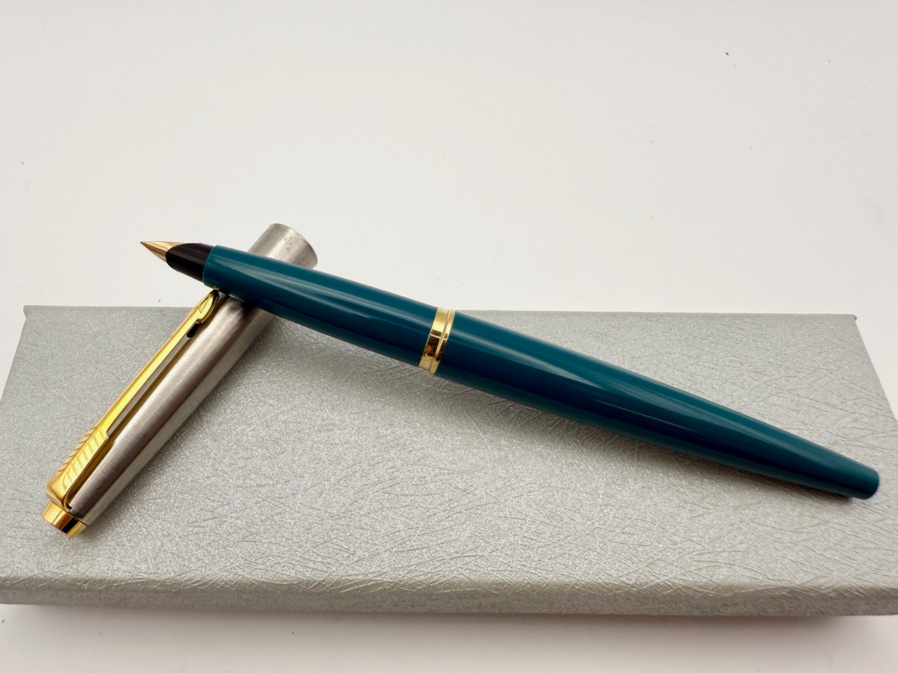 Parker 45 Classic fountain pen in Teal Blue color with a stainless cap and gold trim. Pen has a fine point 14K solid gold nib and is in excellent like new condition. Cartridge or converter fill.