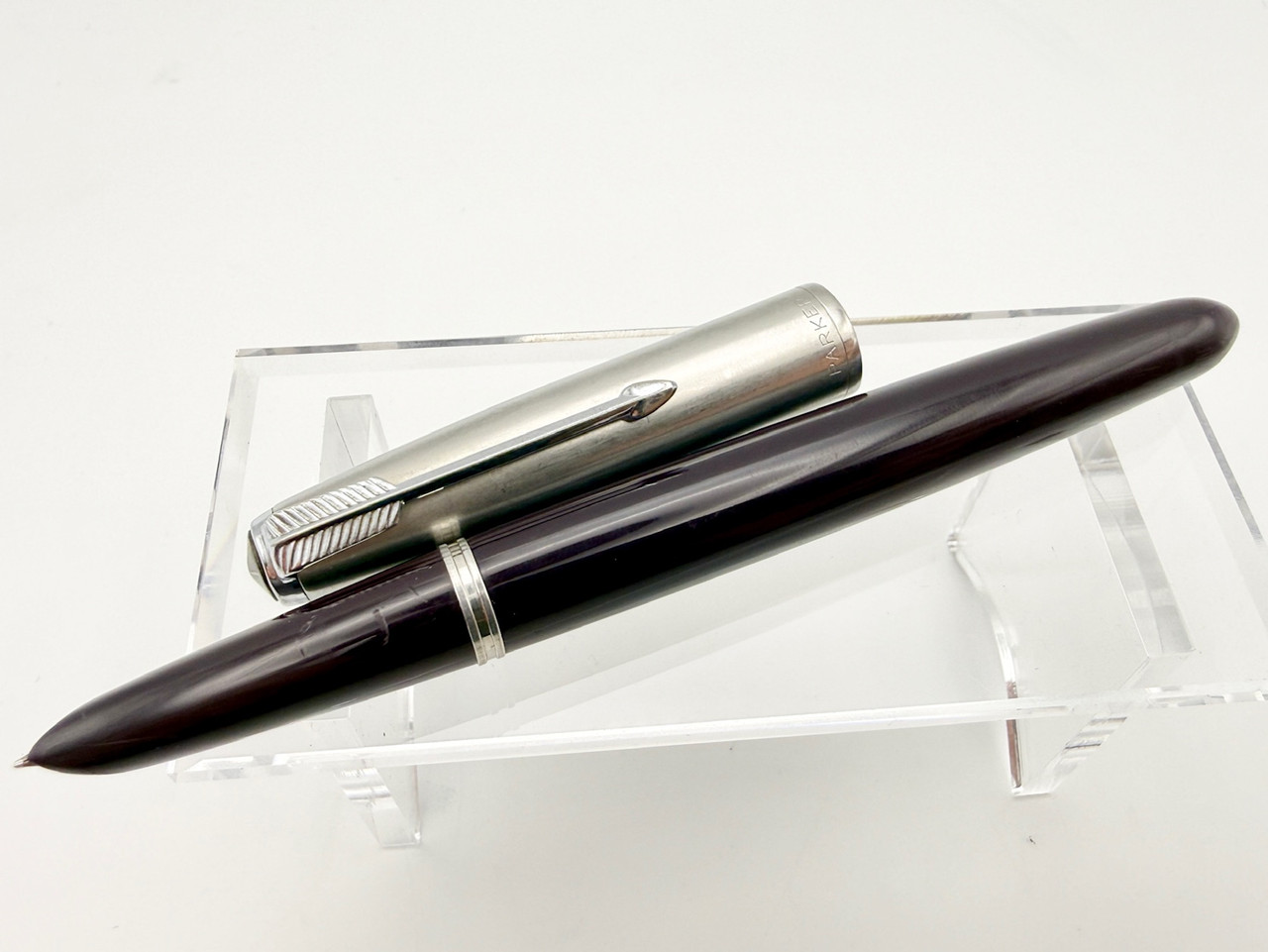 Loading... Please wait...Rare Parker 51 "Plum" Demi Size Aerometric Fill Fountain Pen with a stainless cap. Fountain Pen is in great condition with great dark purple color, small marks on section as can be seen in photos. Fine point 14k gold nib that is very smooth on paper. Aerometric filling system is working perfectly. "50" date code on barrel.