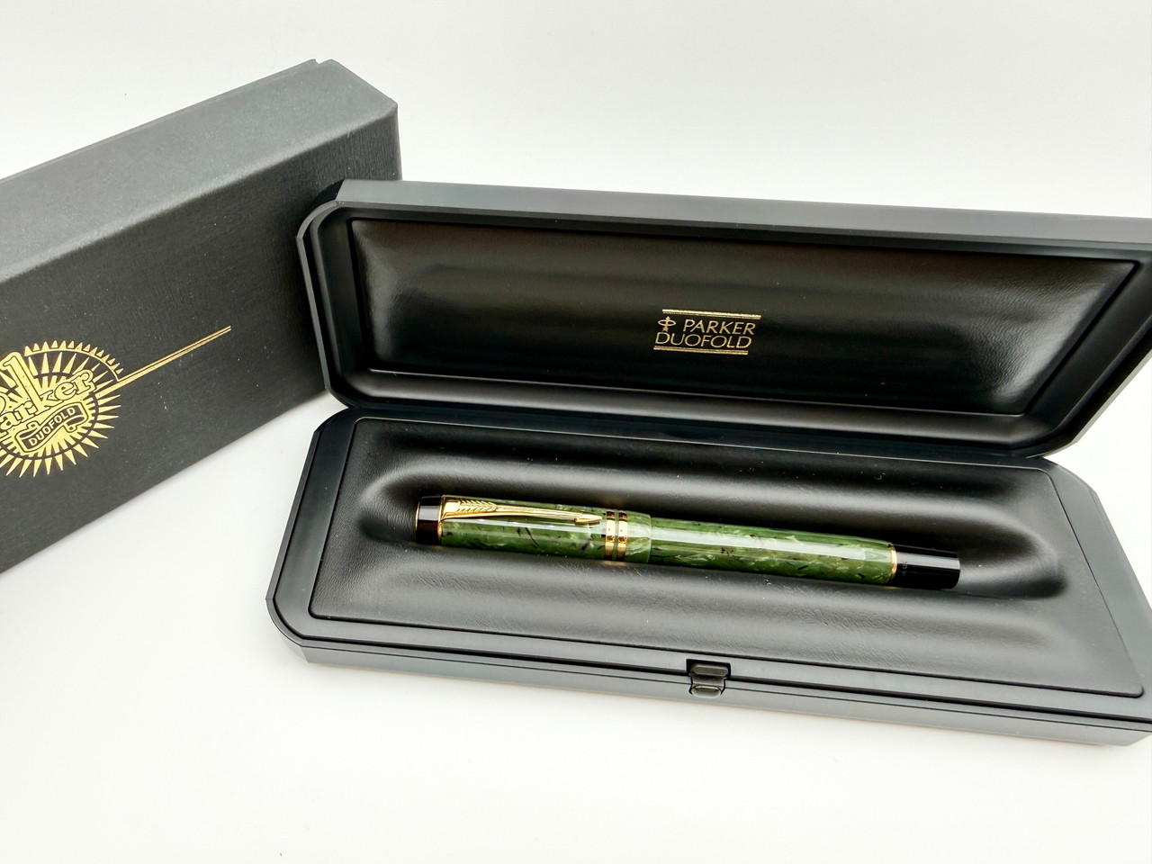 Beautiful new in box 1996 Parker Duofold International Size rollerball pen in Jade Green color. Pen comes in its original Parker Duofold box with outer box.