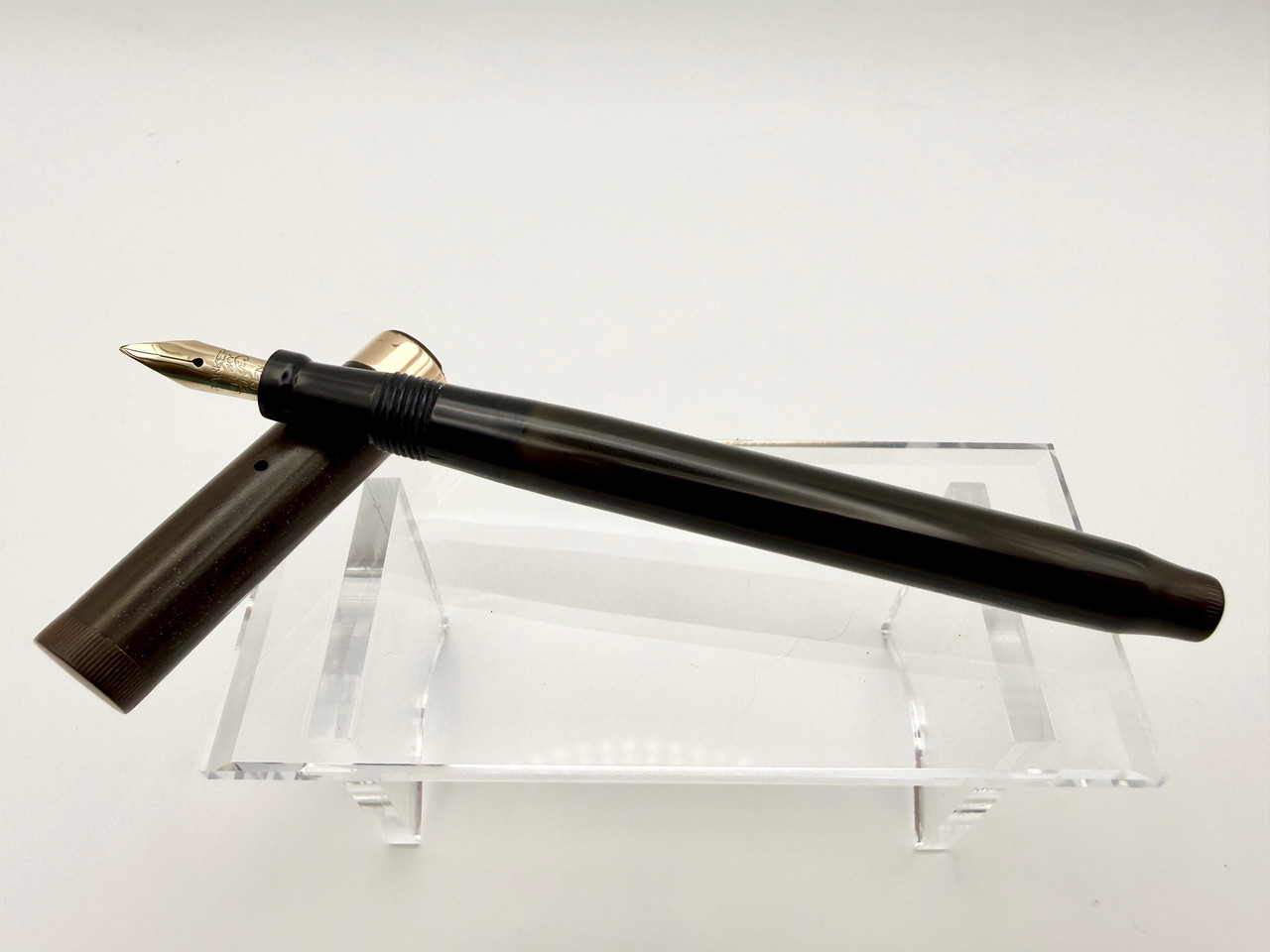 Loading... Please wait...Lovely Parker Lucky Curve #20 1/2 Black chased hard rubber button fill fountain pen. Pen is in good condition with light chasing left on barrel and cap. Great color with no heavy marks, or scratches. Button filling system works perfectly. Fine point Parker Lucky Curve #2 nib that is buttery flexy and gives a wonderful line variation.