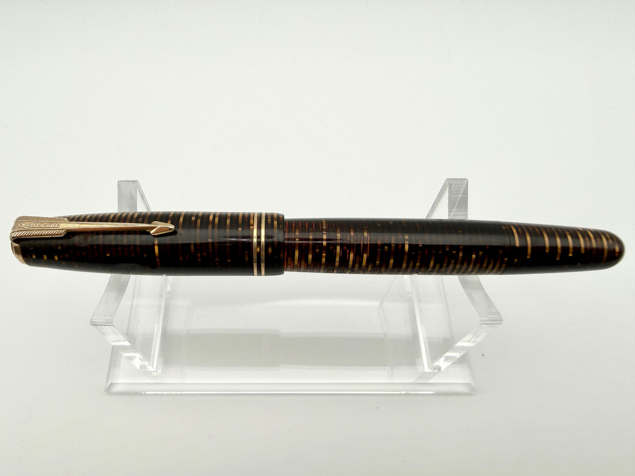 Loading... Please wait...Minty like new Parker Vacumatic Gold Pearl Fountain Pen. Pen is in excellent condition with a clear beautiful gold pearl barrel. Fine point 14k "7" gold nib that is wonderful on paper. Dot 8 Dot Dot date code on barrel and nib. Vac fill system is working perfectly.