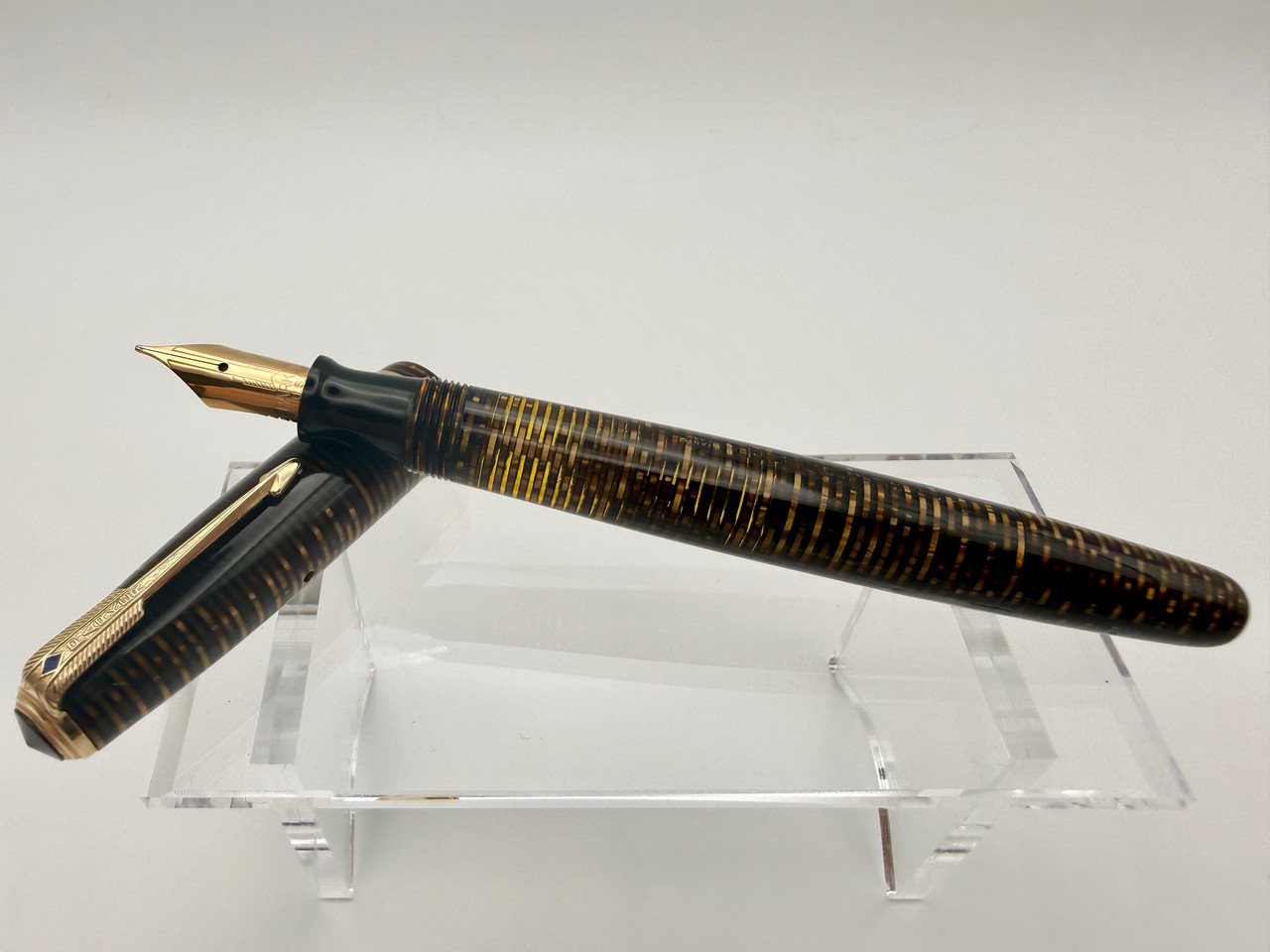 Loading... Please wait...Mint like new Parker Vacumatic Gold Pearl Fountain Pen that seems to have never been inked. Pen is near perfect with a clear beautiful gold pearl barrel. Fine point 14k gold nib that is wonderful on paper. Dot 6 Dot Dot date code.