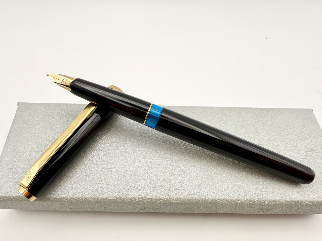 Vintage 1970's Pelikan M480 Fountain Pen in Black with gold trim. Fountain pen has a Fine point 14k solid gold nib that is very smooth on paper. Piston filling unit that works perfectly and holds a great amount of ink. Pen is in excellent condition with no heavy marks or ink stains inside barrel.