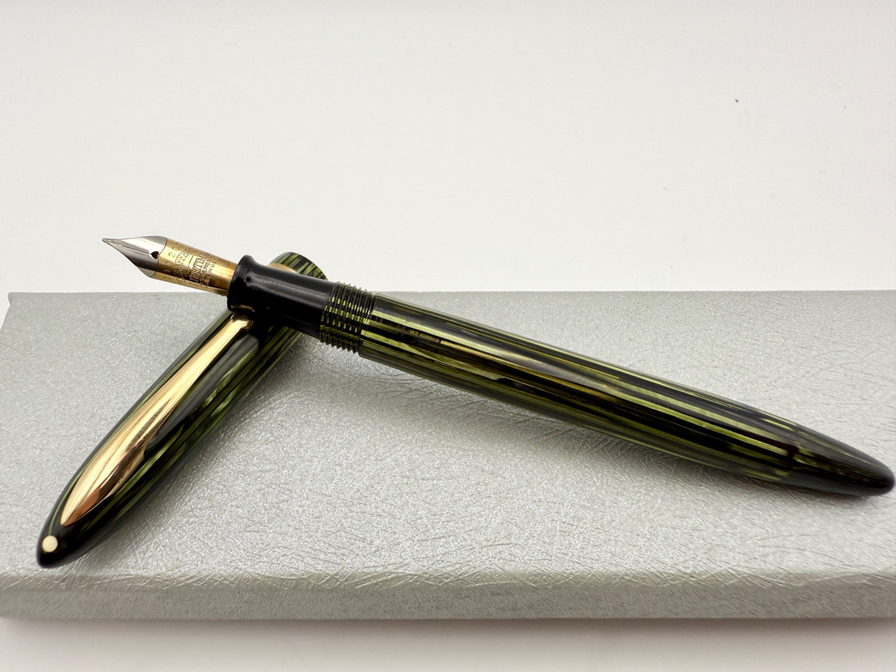 Loading... Please wait...Minty Sheaffer Lifetime Slender Balance Vac-Fill Fountain Pen in Green Striated color. Pen is in excellent condition with great color and deep barrel imprint. Translucent barrel where ink is stored showing pen seems to have never been inked. Extra fine point 2-tone 14k solid gold nib that is very smooth on paper and a great writer. Vac filling system is working perfectly.