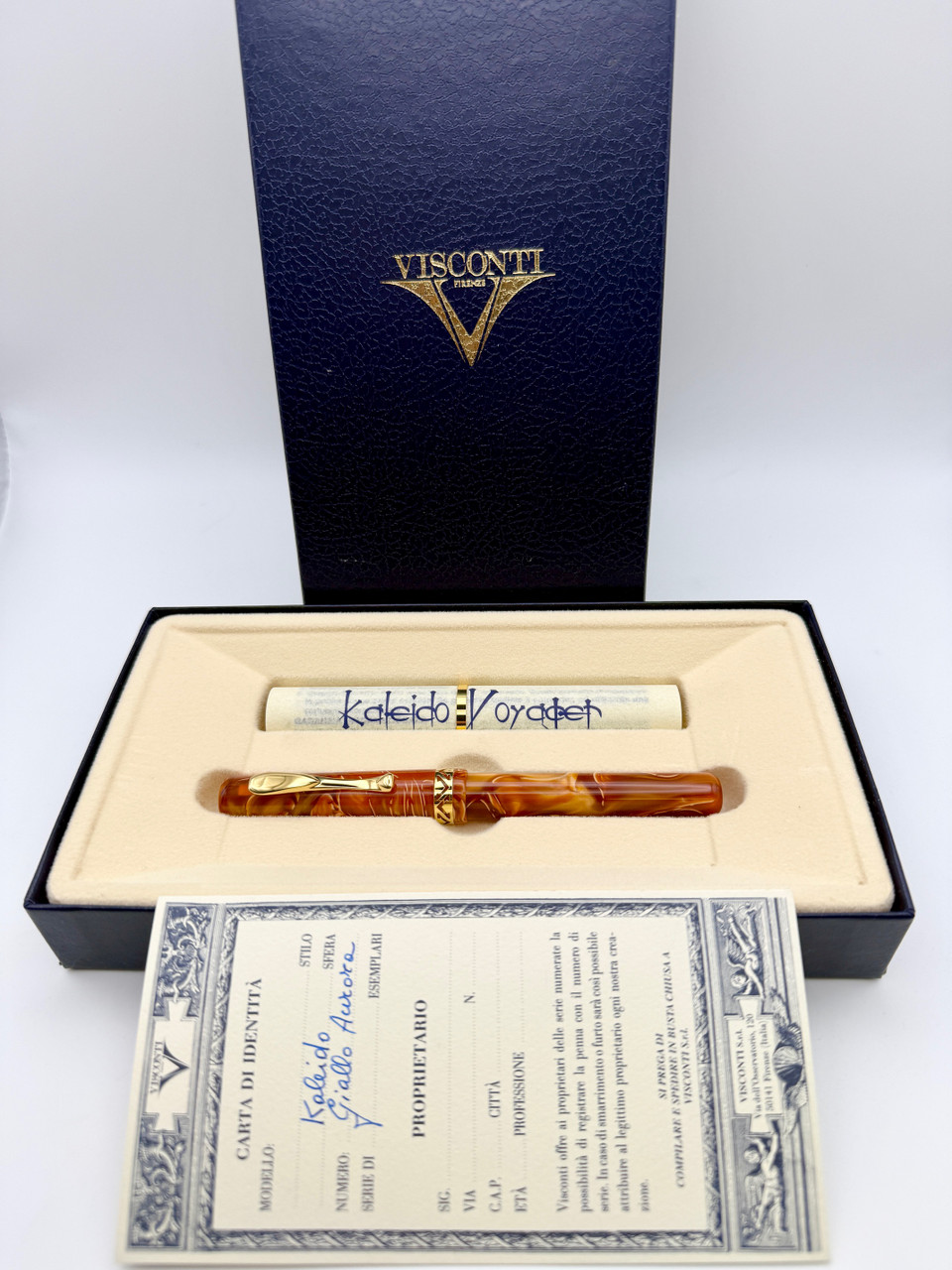 Loading... Please wait...Beautiful Visconti Koleido Voyager Rollerball Pen in gorgeous Yellow Dawn Acryloid. Pen comes in original box with paperwork talking about everything about the pen! Absolutely beautiful rollerball pen with an amazing feel in hand.