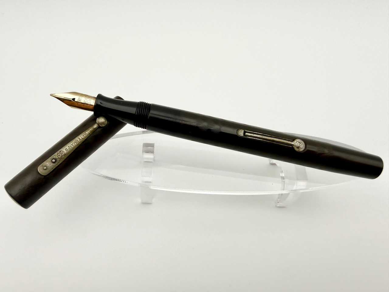 Loading... Please wait...Waterman #52 Black Chased Hard Rubber Fountain Pen in great condition with good color and chasing left, good readable barrel imprints, and nice nickel trim. Fine point #2 Waterman Buttery Flexible nib that gives an amazing line variation and is very smooth on paper.