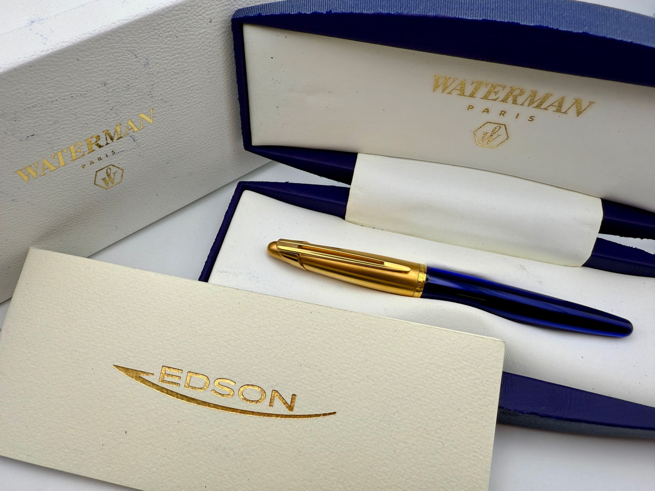 Loading... Please wait...Beautiful Waterman Edson Fountain Pen in stunning Sapphire blue color. Pen comes in its original Edson box with outer box, booklet, and blue converter. Fine point 18k solid gold nib that is extremely smooth on paper. New condition with no signs of being inked.